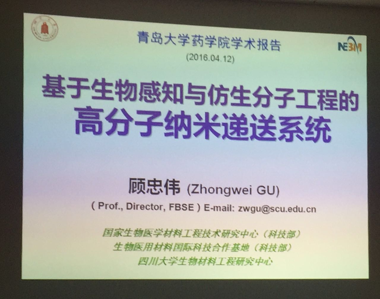 国家生物医学材料工程技术研究中心主任、国家“973”计划生物材料领域首席科学家顾忠伟教授应公司药剂学科邀请来公司太阳集团tyc151cc进行学术交流。4月12日上午,顾忠伟教授在登州路校区太阳集团tyc151cc三楼会议室做了题为《基于仿生分子工程的高分子纳米递送系统》的学术报告,太阳集团tyc151cc王克威、李英霞、王威、王继波等教授以及数十名博士、硕士研究生参加了这次学术报告会。报告会由公司药剂学科负责人孙勇教授主持。