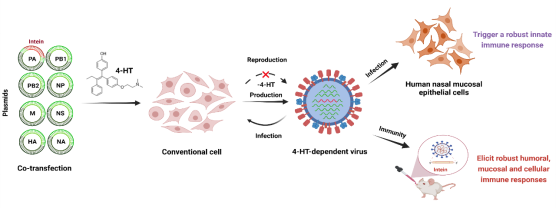 全世界每年有多达65万人死于季节性流感病毒感染,而新冠病毒流行以来也已在全球造成累计近250万人死亡,致病病毒的防治仍然是全球迫切的公共卫生问题之一。接种疫苗被证明是预防病毒性疾病最高效、最有力的方法。然而,新冠病毒和流感病毒的市售疫苗在真实世界的免疫保护效力有限。最大程度的保留病毒所有抗原,快速构建高变异活病毒疫苗的通用方法,一直是疫苗工作者追求的目标。目前大多数疫苗依赖于灭活或减毒技术,但这两种技术都有其局限性和相关的潜在问题。灭活疫苗通常是无害和无传染性的,但产生的免疫反应维持时间较短,需要多次注射来增强其整体免疫原性。减毒活疫苗保留了活病毒的大部分基因序列,具有免疫力强、作用时间长等优点,但仍具有潜在致病危险。减毒活疫苗的产生有多种策略,包括携带提前终止密码子(PTC)的病毒、高干扰素敏感病毒、蛋白降解靶向嵌合病毒(PROTAC)等。目前的减毒策略往往伴随着安全性、有效性或生产力的降低或丧失。此外,季节性流行性流感持续的抗原漂移和转移导致的免疫逃逸给常规流感疫苗的效力带来了巨大的挑战。因此,提升减毒活疫苗的安全性和有效性是当前疫苗研发的重要方向。
