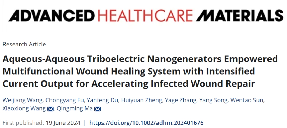 针对以上问题,公司马庆明教授团队联合物理公司王晓雄教授团队基于双水相体系的液-液相分离原理,构建了新型水-水摩擦电纳米发电机(A-A TENG)。凭借其独特的水相摩擦层材料物理性质,保证了高效、完全的接触与分离过程,显著提升了输出电流密度。在此基础上,利用A-A TENG的高电信号输出作为治疗性电刺激,开发了新型多功能伤口愈合体系:A-A TENG产生的电信号通过导线传输至贴附在伤口上的导电水凝胶,确保电场的均匀性和稳定性;增强的电流输出不仅可以直接调节细胞迁移行为,还可以增强抗菌作用,从而在创伤愈合的多个阶段发挥重要作用,全流程加速创伤愈合。A-A TENG展现了一种新型TENG的全貌,其超高的电流输出密度、独特的接触分离方式以及摩擦层的生物安全性不仅为创伤愈合提供了新的选择,而且预示着其在多个生命科学领域的潜在重要作用。该项工作以“Aqueous-Aqueous Triboelectric Nanogenerators Empowered Multifunctional Wound Healing System with Intensified Current Output for Accelerating Infected Wound Repair” 为题发表在国际权威学术期刊《Advanced Healthcare Materials》(1区TOP,IF=11.092)。公司马庆明教授、物理公司王晓雄教授为论文通讯作者,2022级硕士研究生王伟江为该论文的第一作者。研究工作得到了国家自然科学基金、山东省泰山学者青年专家人才计划、山东省高等公司青创科技计划创新团队发展计划等项目资助。