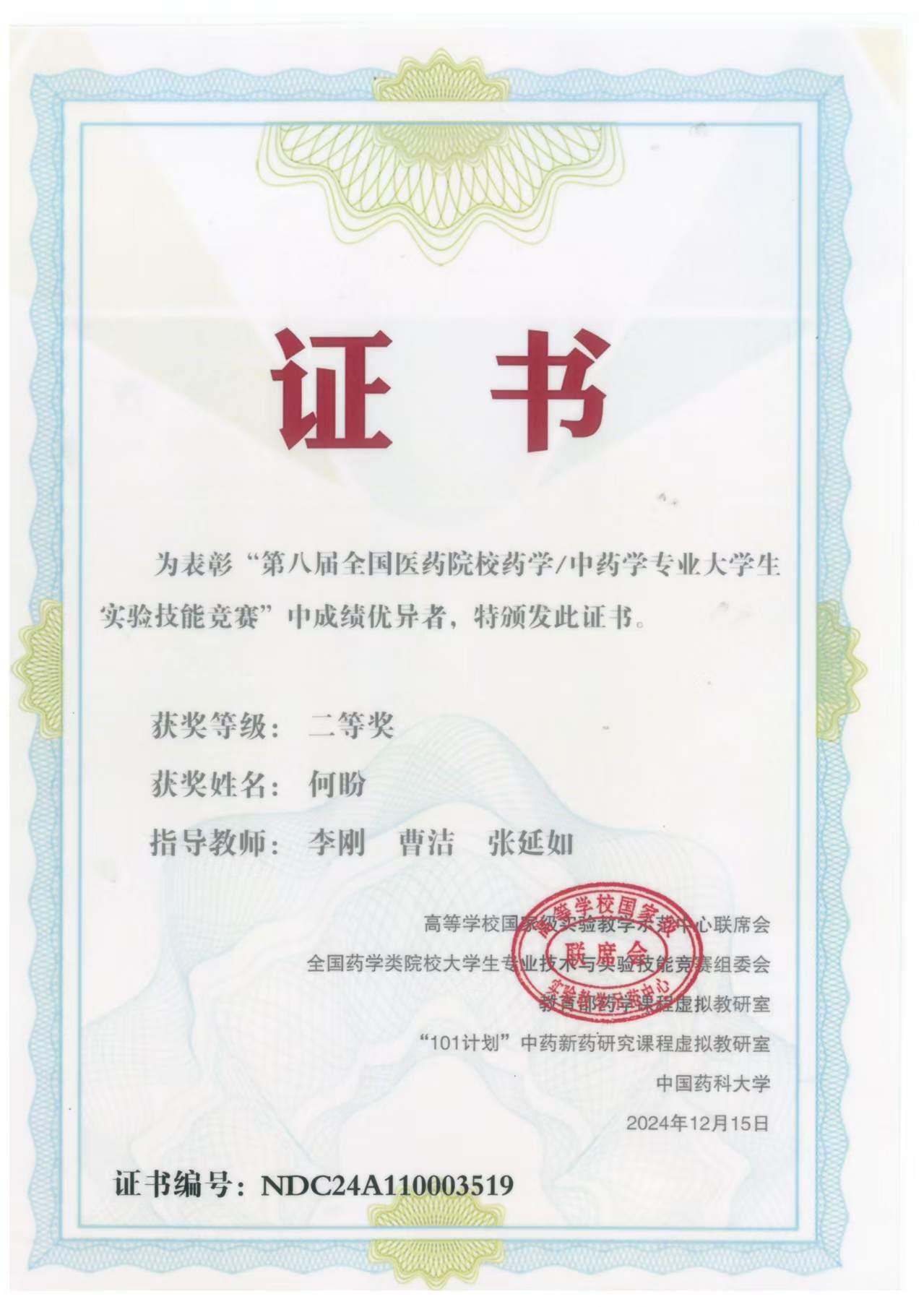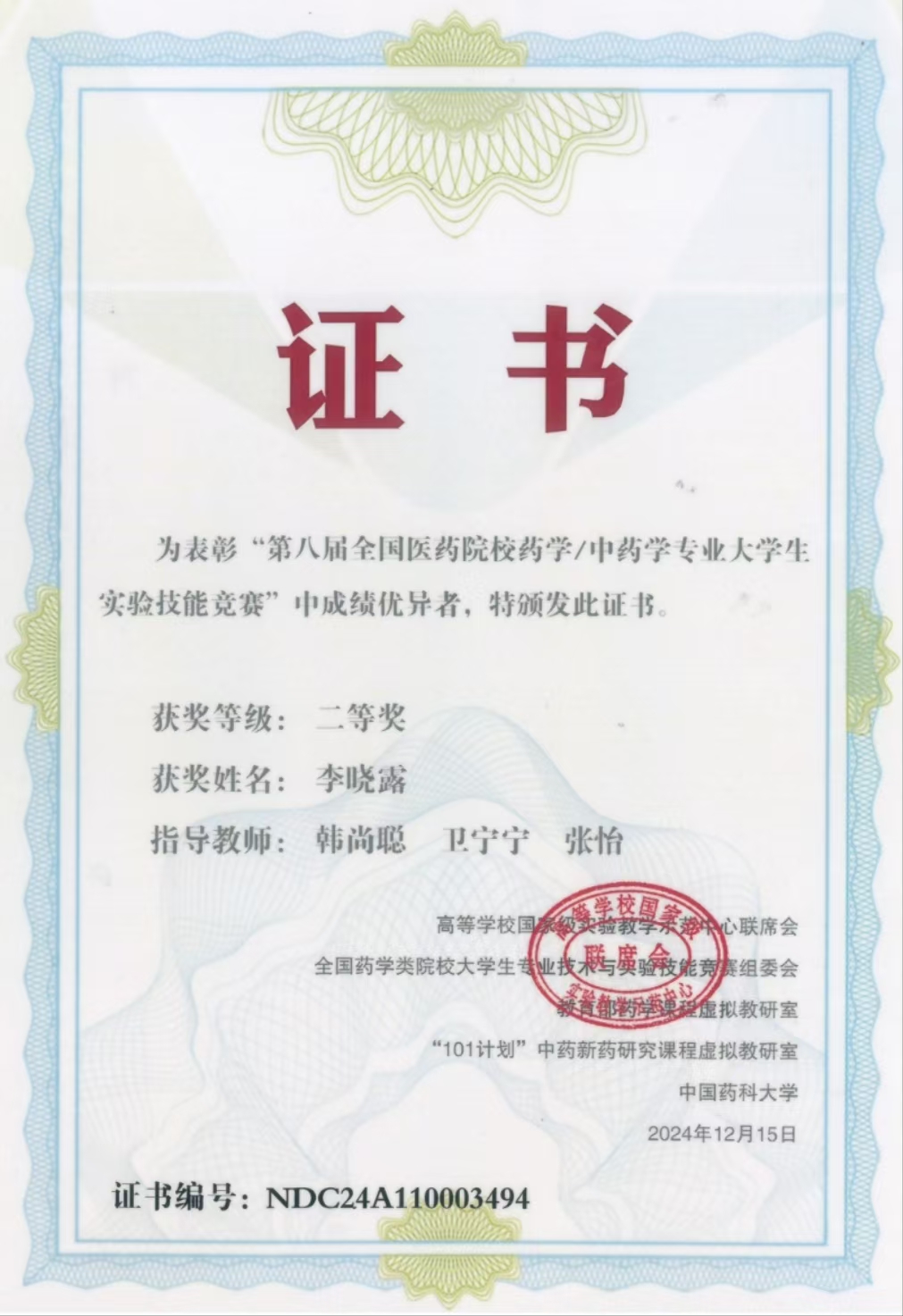 2024年12月13日至16日,第八届全国医药院校药学/中药学专业老员工实验技能竞赛在四川省成都市成功举办。本次大赛由教育部高等公司国家级实验教学示范中心联席会、全国药学类院校老员工专业技术与实验技能竞赛组委会、教育部“药学课程”虚拟教研室、“101计划”中药新药研究课程虚拟教研室以及中国药科大学联合主办,成都中医药大学承办。经过多轮激烈的比拼,公司2021级本科生李晓露、何盼均以卓越的表现荣获竞赛二等奖。
