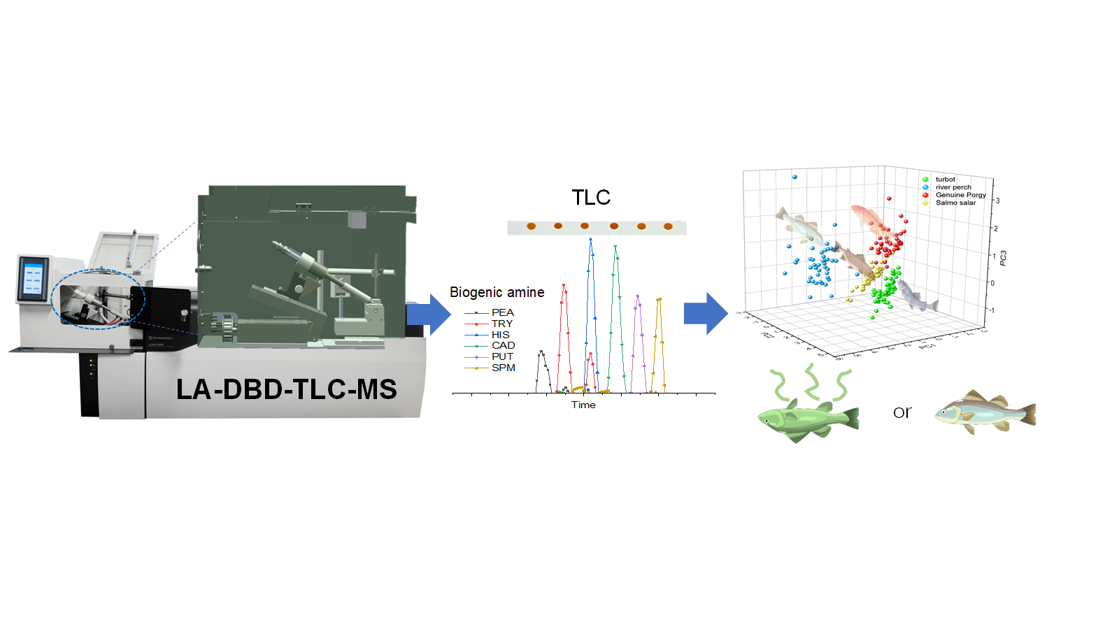 近日,公司丁薛璐、梁帅团队研制了一款新型、紧凑、全自动激光烧蚀介质阻挡放电薄层色谱-质谱检测装置(LA-DBD-TLC-MS)(图1)。通过正交实验设计和气流仿真模拟,优化了包括放电条件、等离子体光束方向、激光输出和基体材料浓度在内的关键参数,成功将该仪器应用于水产品中致毒BAs的快速检测,其定量分析结果与HPLC-MS/MS相当。同时,结合机器学习算法对鱼类进行物种识别和腐败评估。研究发现,富含氨基酸和咪唑的深海鱼在变质时更容易产生BAs,尤其是组胺和酪胺。这些胺类物质可以作为监测渔业产品质量和安全的关键标志物。此外,利用PCA、RF、SVM、MLP和MLR等机器学习算法对量化后的BAs数据进行物种区分和腐败时间评估,测试集准确度高于96%。