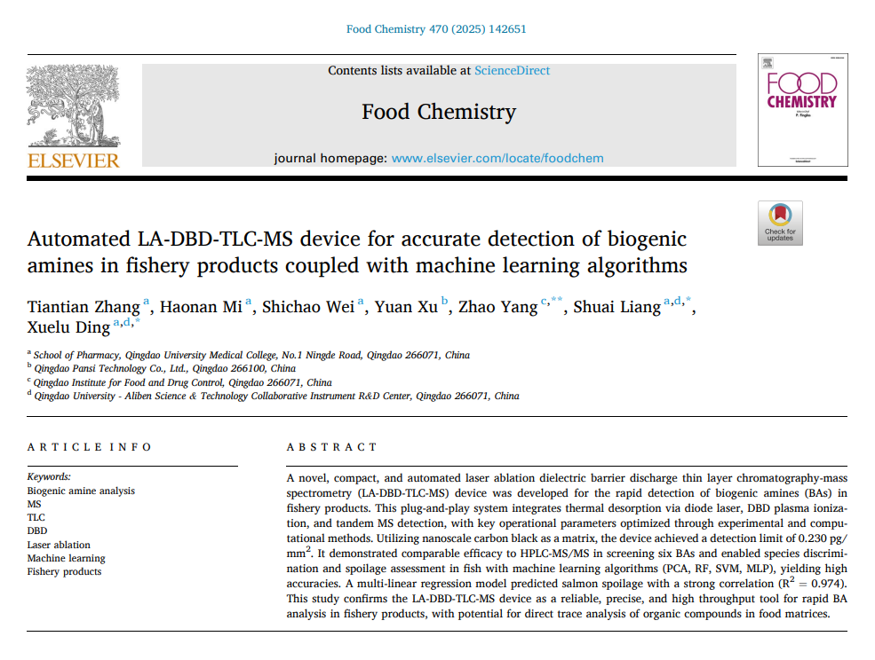 LA-DBD-TLC-MS采用全机械化触摸控制系统,能够提供精细的采样和检测程序,可最大限度地减少与手动操作相关的分析错误,为水产品中生物胺的定性和定量分析提供了一种易于操作且高效的方法。此仪器与方法分析时间短、灵敏度高,检测限和日间、日内重复性低,分析准确度高,对加强食品安全监测和阐明腐败机制具有广泛意义。未来将其整合到食品分析工作流程中,可以显著提高现场监测海鲜及其他食品质量和安全的能力。近日,该研究成果发表于食品化学领域顶刊《Food chemistry》(中科院1区top期刊,IF=8.5),题为Automated LA-DBD-TLC-MS device for accurate detection of biogenic amines in fishery products coupled with machine learning algorithms。公司药物分析学研究生张甜甜为论文第一作者;青岛市食品药品检验研究院杨钊、公司梁帅和丁薛璐为该论文的共同通讯作者。