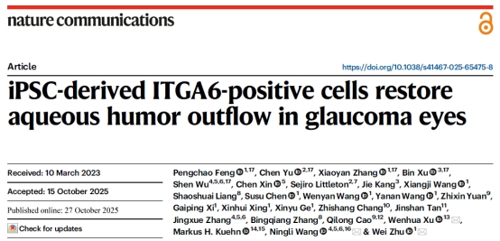 公司朱玮教授课题组2024届博士生封鹏超和张晓燕同学在《Nature communications》上发表了攻读博士期间的第1篇研究论文,论文题目为“iPSC-derived ITGA6-positive cells restore aqueous humor outflow in glaucoma eyes”(DOI:10.1038/s41467-025-65475-8)。公司封鹏超和张晓燕、美国杜克大学Chen Yu博士、中国海洋大学徐彬副教授和首都医科大学附属北京同仁医院武珅助理研究员为本文的第一作者。朱玮教授、太阳集团tyc151cc再生医学与检验创新研究院经理徐文华教授、首都医科大学附属北京同仁医院王宁利教授为本文通讯作者。公司为第一单位和通讯单位。