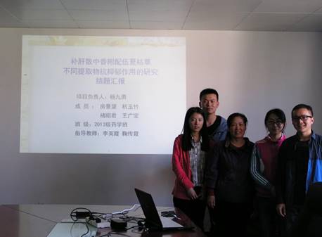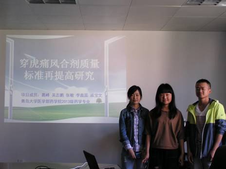 本次参加答辩的全是2013级本科药学班的同学,有竺爱琴同学负责的国家级项目《硫酸软骨素抑制6-羟基多巴胺能神经细胞损伤的机制研究》,杨九勇同学负责的校级项目《补肝散中香附配伍夏枯草不同提取物抗抑郁作用的研究》和葛峰同学负责的校级项目《穿虎痛风合剂质量标准再提高研究》。