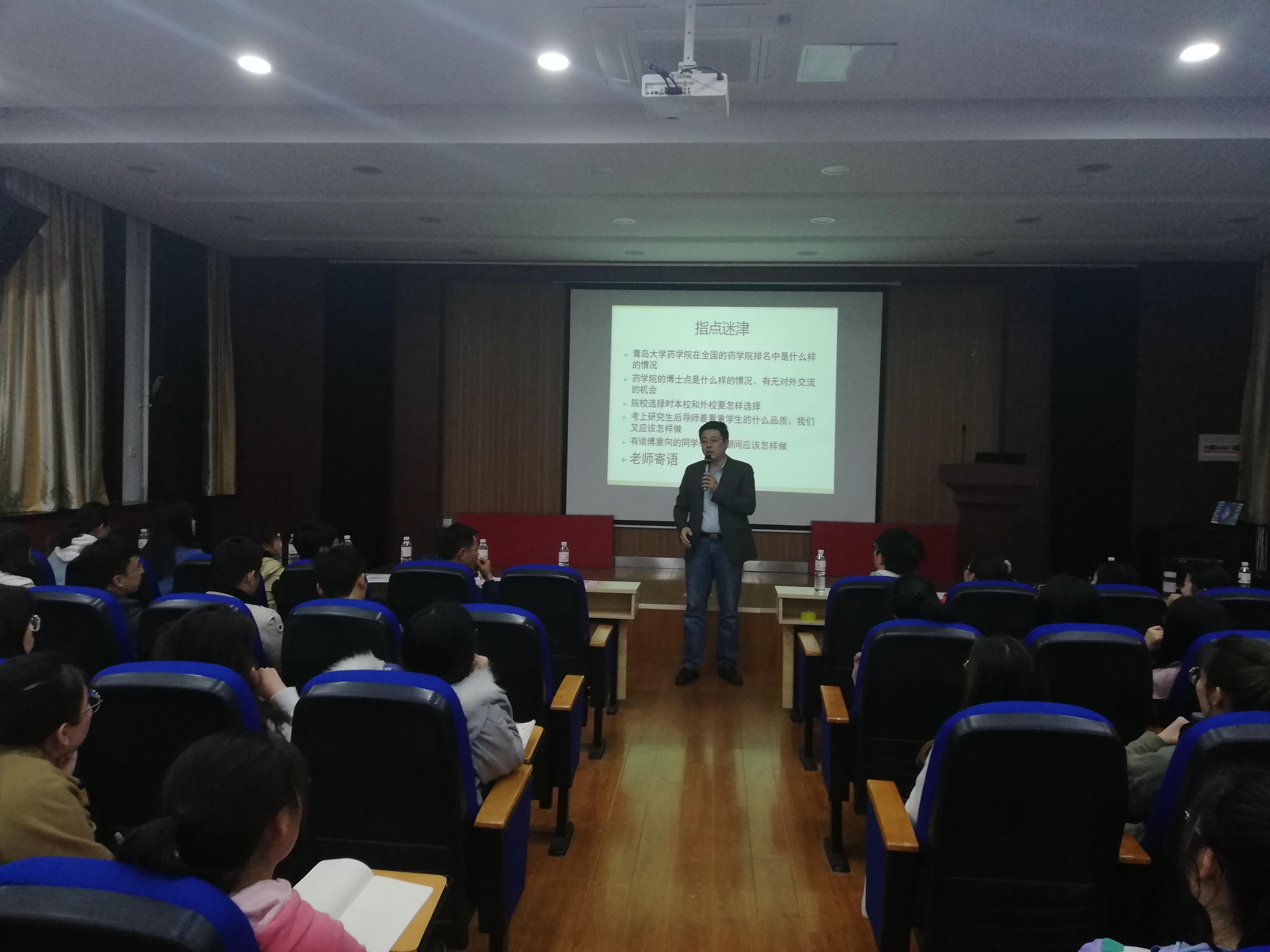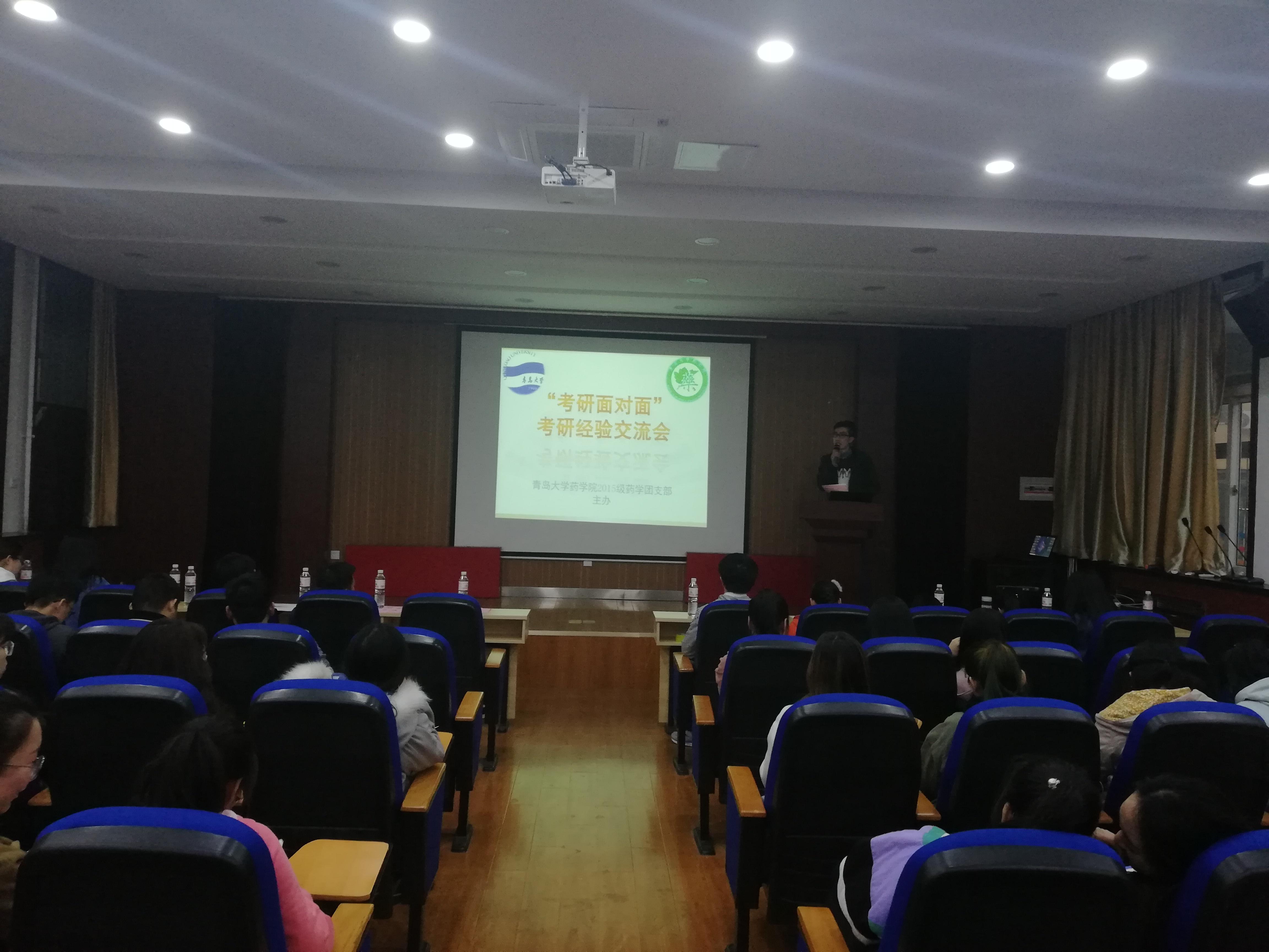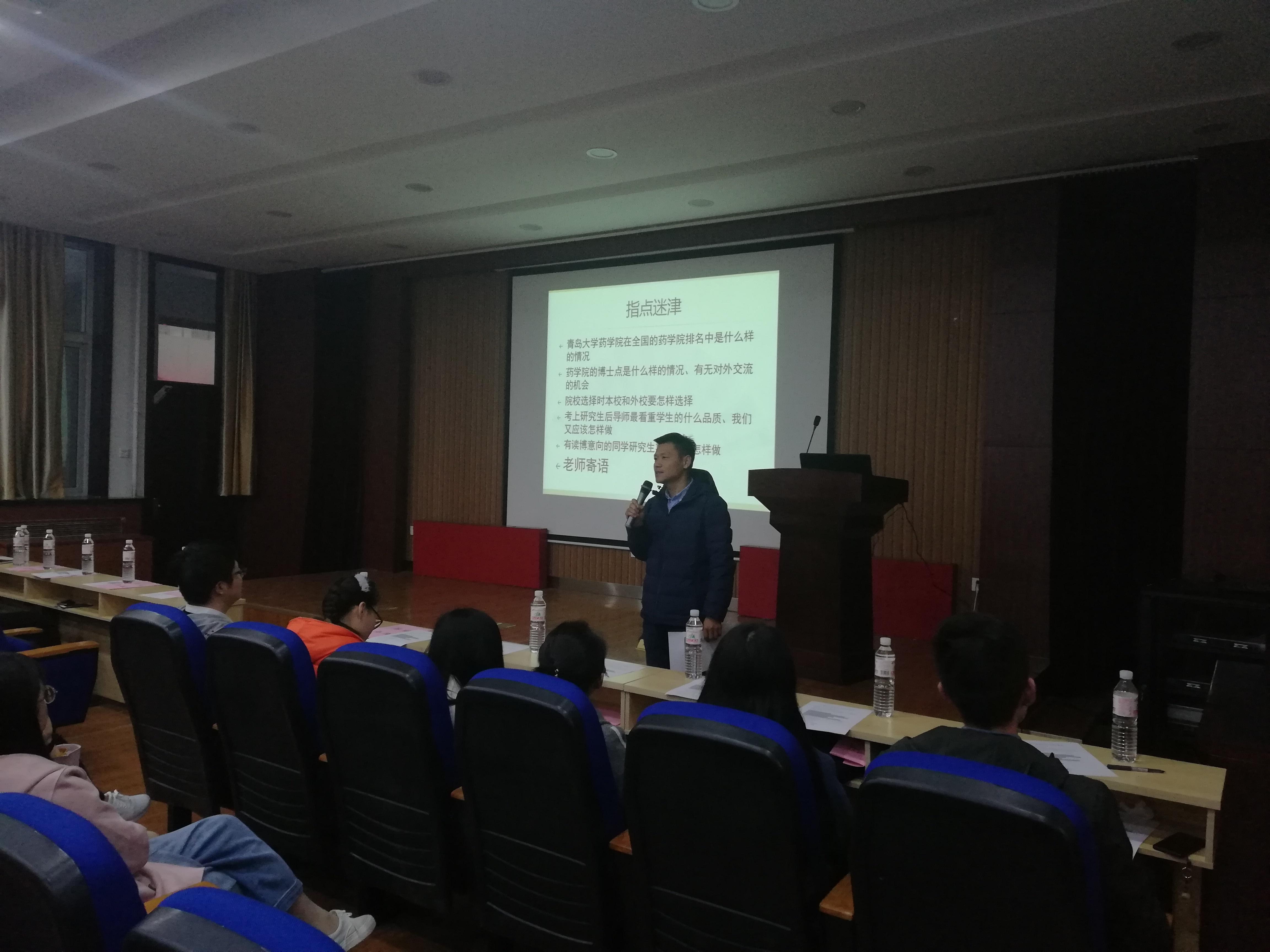 2018年4月17日晚,太阳集团tyc151cc于松山校区学术报告厅成功召开“考研面对面”经验交流会。药公司党委副书记李政,副经理孙勇,2014级考研成功的同学、2015级全体同学、研究生毕业班班长姜鲁涛参加交流会。