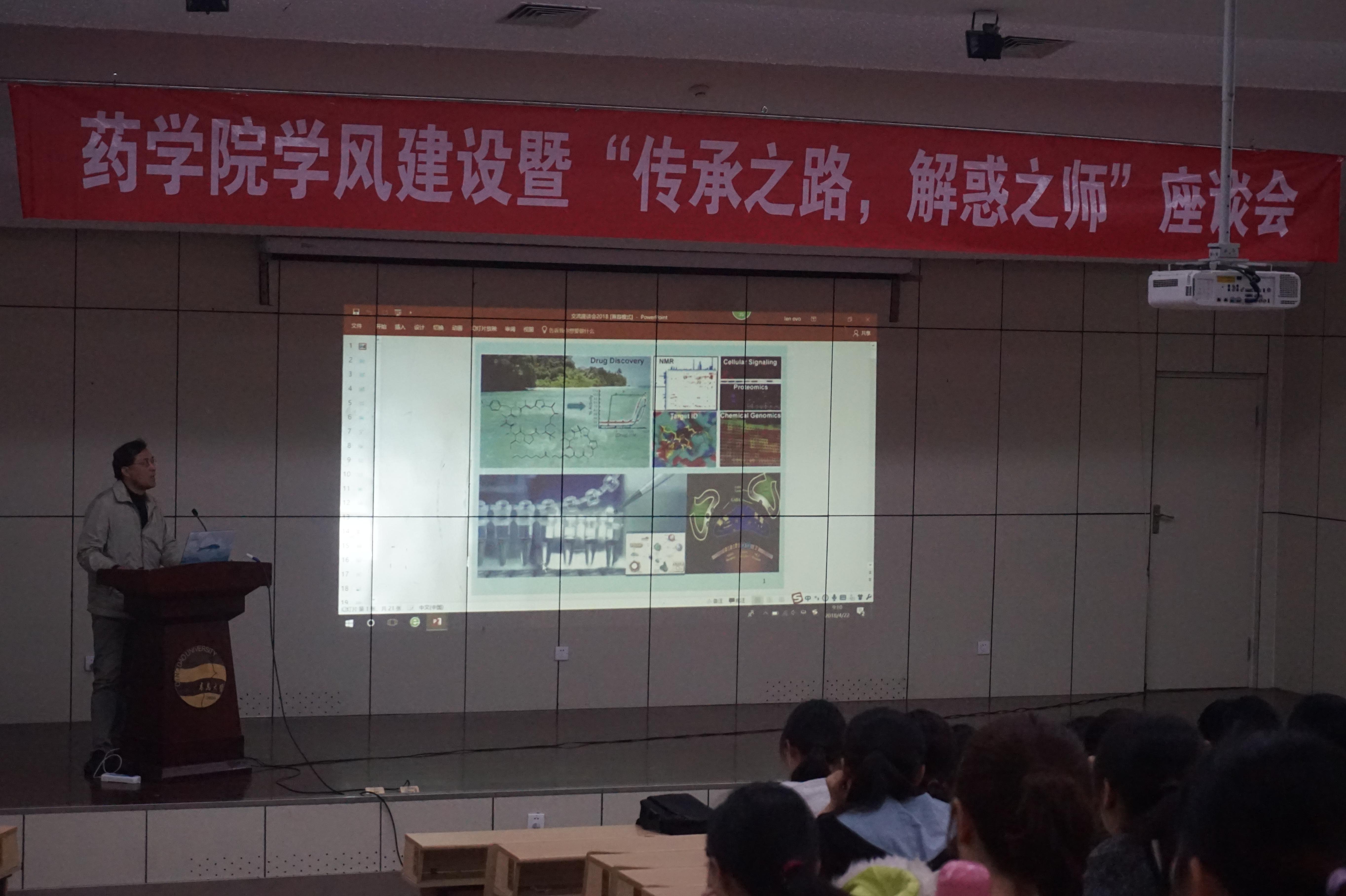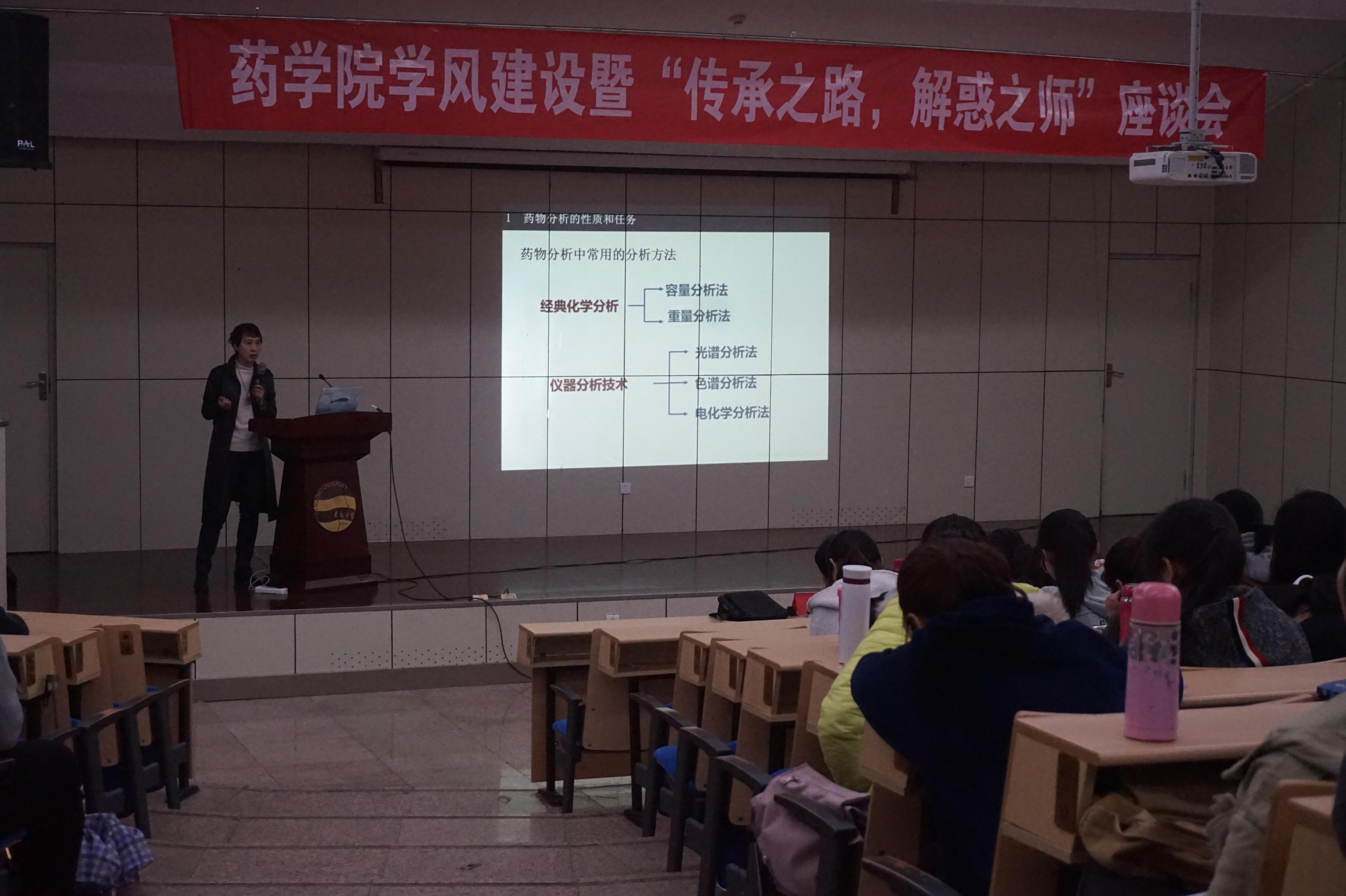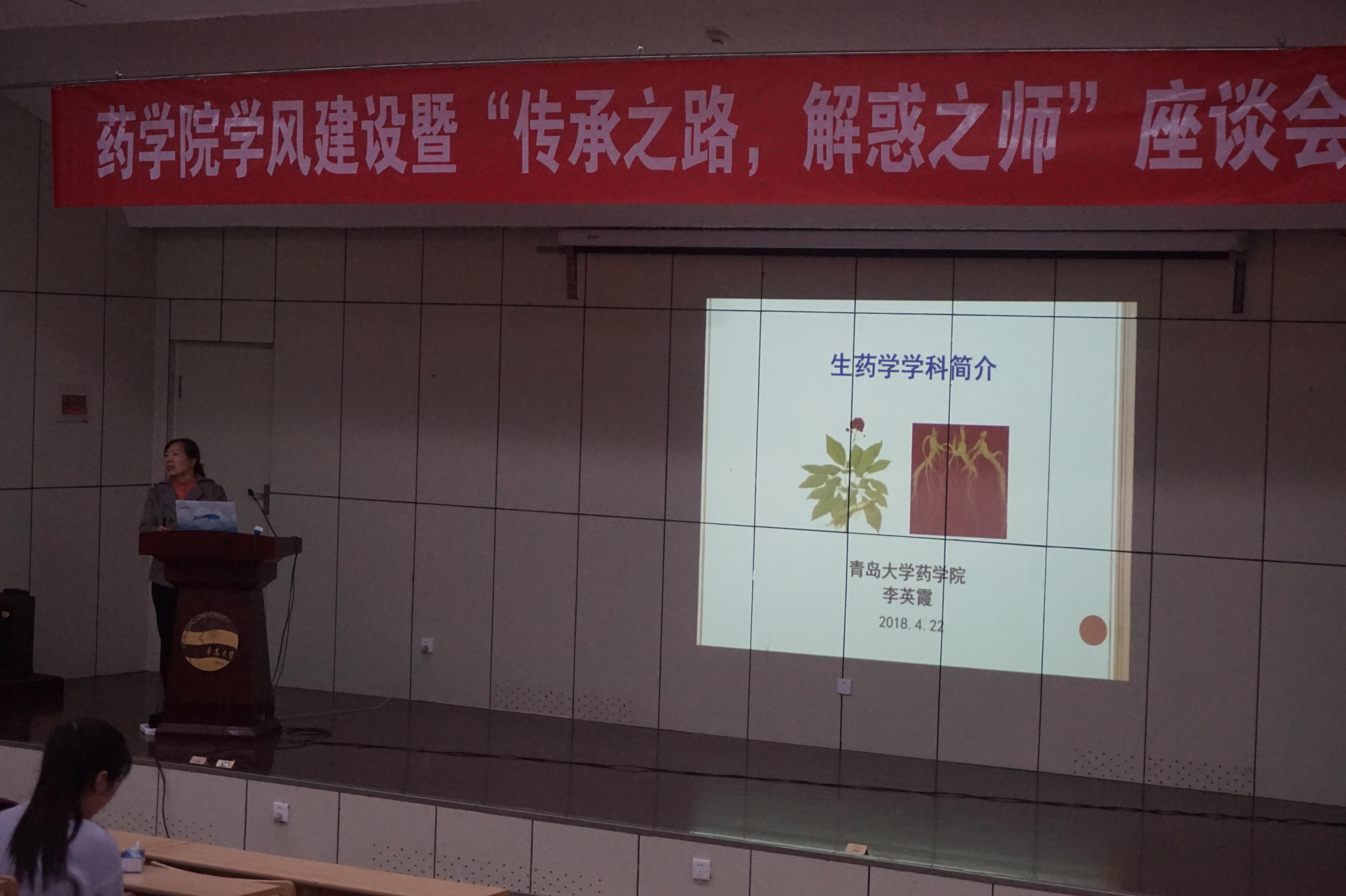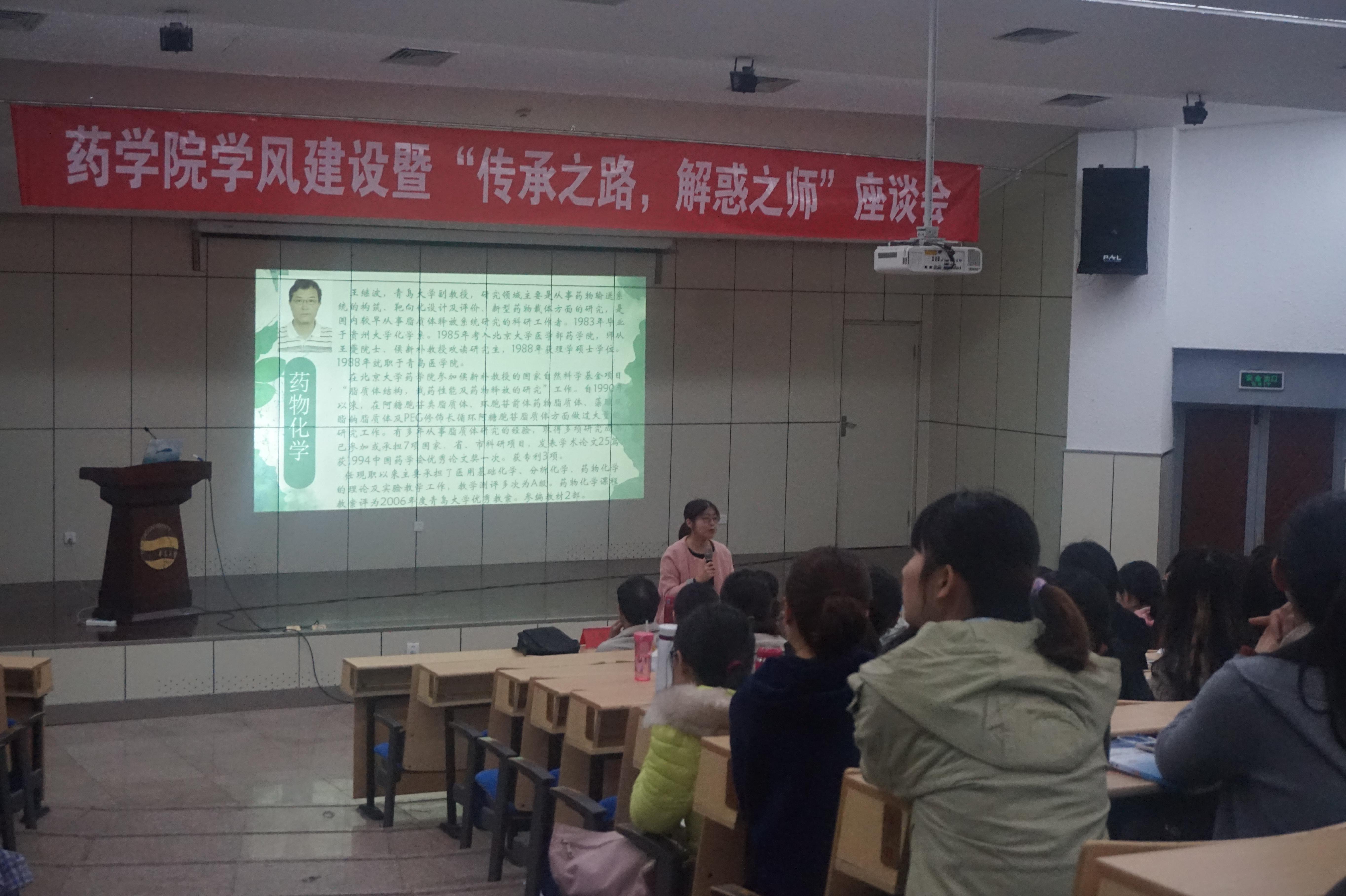 2018年4月22日上午9:00,太阳集团tyc151cc学风建设暨“传承之路,解惑之师”第二场座谈会在图书馆报告厅顺利召开。太阳集团tyc151cc副教授王继波,教授李英霞,药物分析教研室主任刘坤受邀出席,太阳集团tyc151cc辅导员雷舒涵及太阳集团tyc151cc全体低年级员工参与此次会议。