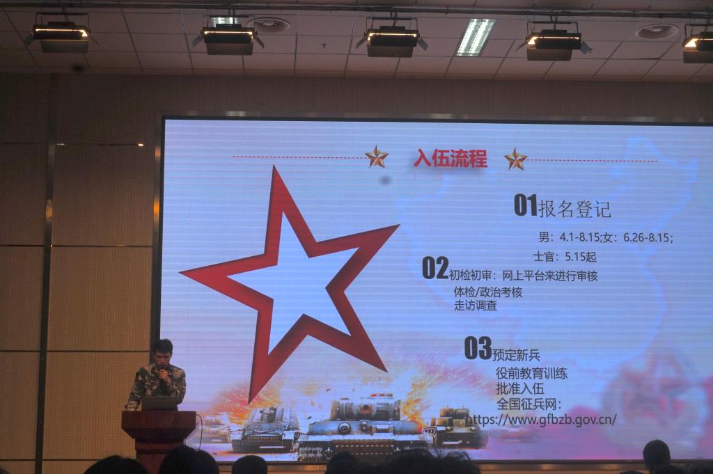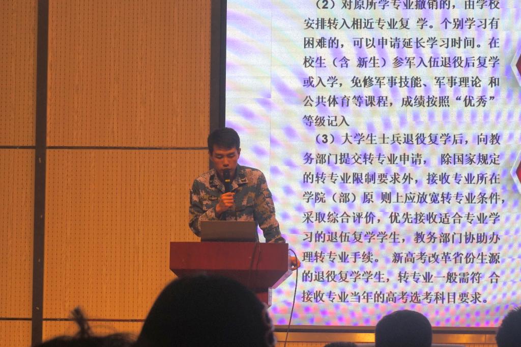 接下来,郁一帆从部队简介、应征入伍基本条件和入伍流程三个方面系统全面地向大家介绍了入伍基本概况,并对老员工参军特别优惠政策进行了详细的解读。最后,他号召同学们要珍惜携笔从戎的机会,把握机遇,切实把参军入伍当作锻炼自己、提升自己的大舞台,让青春在军营的历练中、在保家卫国的奉献中闪光!
