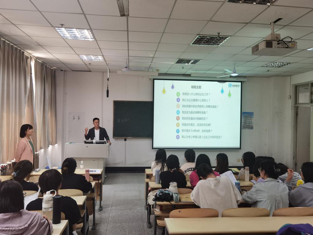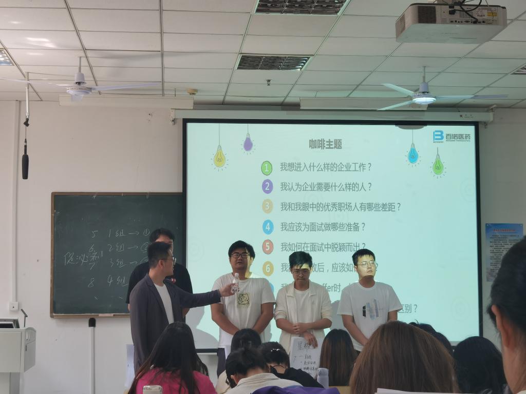 在短暂的课间休息后,田新宇将全体同学分为八组,进行“主题咖啡”环节。该环节由各组分别对“我想进入什么样的企业工作?”“我认为企业需要什么样的人?”“我和我眼中的优秀职场人有哪些差距?”“我应该为面试做哪些准备?”“我如何在面试中脱颖而出?我面试失败后,应该如何去做?”“我手里多个offer时,如何选择?”“我认为考公考编与进入企业工作有何区别?”这八个问题进行讨论,并由小组代表汇报发言。王倩倩与田新宇对各位组长的汇报进行点评,并结合企业实际情况进行补充分享。
