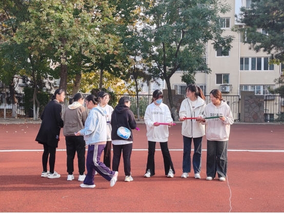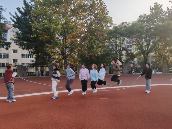 小组队员们团结一致,合力跳大绳,大家借此培养了默契,锻炼了身体,累并快乐着。