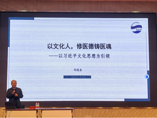 在第二场讲座中,周峨春老师以“以文化人,修医德铸医魂--以习近平文化思想为引领”为主题,从习近平文化思想的发展和内涵、如何弘扬中华优秀传统文化以及中医药文化赋予医德医风极其广阔的历史高度与深度的方面将“习近平文化思想”与“修医德铸医魂”紧密联结起来。周峨春老师还展示了央视《典籍里的中国》伏生以命护《尚书》的桥段、中华优秀传统文化与当下社会治理结合典范“新时代六尺巷工作法”、2022年北京冬奥会24节气宣传片、让曹县再度“出圈”的马面裙、美国“90”后武当学武等中华优秀传统文化传承典范。同时,周峨春老师分享了“人与人,人伦和睦”这一心得,亲切地讲述自己与员工和睦相处,在平时的交流中做到诚信友善,互相尊重欣赏的故事。最后,周峨春老师分享了泰戈尔的诗《用生命影响生命》,“愿每个人都能活成一道光,绽放着所有美好。”