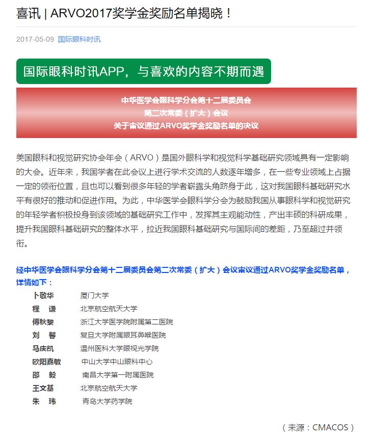 2017年5月9日,经中华医学会眼科学分会第十二届委员会第二次常委(扩大)会议审议通过美国眼科和视觉研究协会年会(ARVO)奖学金奖励名单,太阳集团tyc151cc朱玮博士荣获该奖学金。