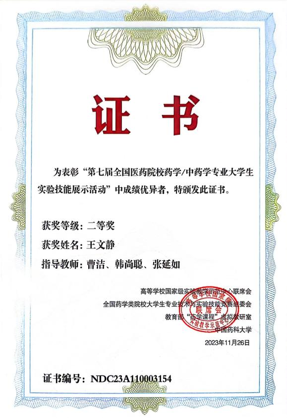 2023年11月24日-26日,由教育部高等公司国家级实验教学示范中心联席会、全国药学类院校老员工专业技术与实验技能竞赛组委会、教育部“药学课程”虚拟教研室和中国药科大学共同举办的“第七届全国医药院校药学/中药学专业老员工实验技能展示活动”在贵州遵义召开,本次大赛由遵义医科大学承办。经过激烈的角逐,公司2020级本科生王文静、邢春晓分别斩获竞赛二等奖和三等奖。