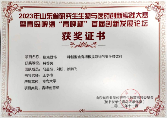 公司王克威教授团队的硕士研究生马曼茹、刘妍、徐鹏飞等同学组成参赛队伍参加比赛,指导教师为王李梅老师。本次参赛项目“椒点登场——一种新型含有胡椒提取物的果汁茶”获得专家评委的一致好评,荣获青啤创意组“特等奖”。“椒点”创意立足“更健康,更新颖,更潮流”的理念,对年轻人对饮料的消费趋势展开广泛问卷调查,该团队根据问卷调查的结果以及社会饮料市场的消费趋势,设计了具有降脂功效的果汁茶功能饮料。“椒点”不仅与当下“无糖、健康”的饮料消费趋势相吻合,且口味丰富多元,具有降脂功效,真正做到了“更健康,更新颖,更潮流”。下一步,团队将继续提升研究生创新与实践能力培育,推动创意成果的转化。