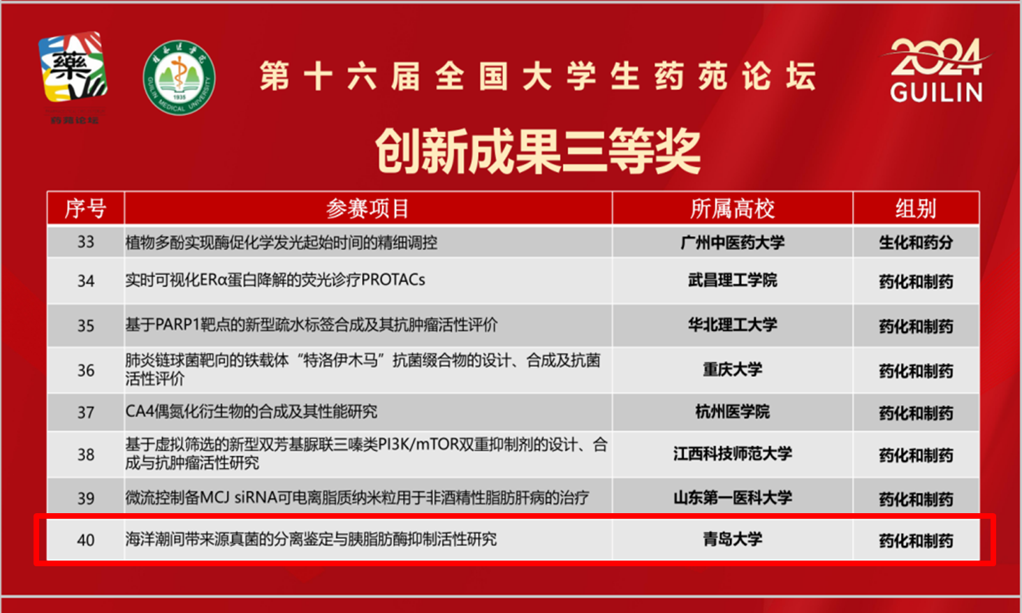 自第十六届药苑论坛筹备工作启动以来,公司高度重视,从药学领域的各项研究项目中遴选出具有创新性和实践价值的课题,进行细致培育和合理孵化。由曹洁教授指导的2022级药学专业本科生王艺霖负责的项目《补氧型温敏脂质体用于细菌性关节炎的光动力学研究》获药学科学赛道创新成果二等奖。由孙世伟副教授指导的2021级药学专业本科生孙雨萌负责的项目《海洋潮间带来源真菌的分离鉴定与胰脂肪酶抑制活性研究》获药学科学赛道创新成果三等奖。