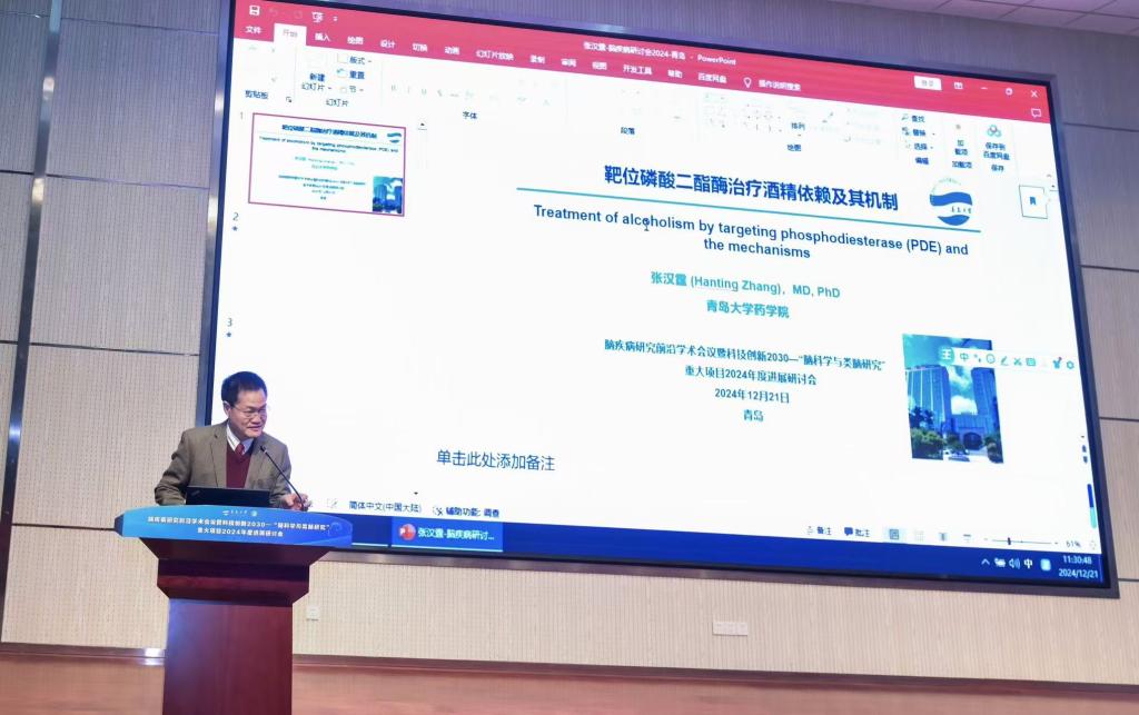 太阳集团tyc151cc首席教授、国家高层次计划领军人才、山东省“泰山学者海外特聘专家”、山东省脑疾病机制与防控重点实验室主任、原太阳集团tyc151cc经理张汉霆教授作了《靶位磷酸二酯酶治疗酒精依赖及其机制(Treatment of alcoholism by targeting phosphodiesterase (PDE) and the mechanisms)》的报告。抑制PDE4能够增加细胞内cAMP浓度,从而调节神经递质的释放和神经元的兴奋性,进一步调节纹状体多巴胺D1和D2神经元的平衡。这种调节作用可以影响个体对酒精的渴望和摄取行为,达到治疗酒精依赖的目的。酒精依赖是常见的成瘾问题,通过靶向磷酸二酯酶治疗酒精依赖,为解决这一难题带来了曙光。
