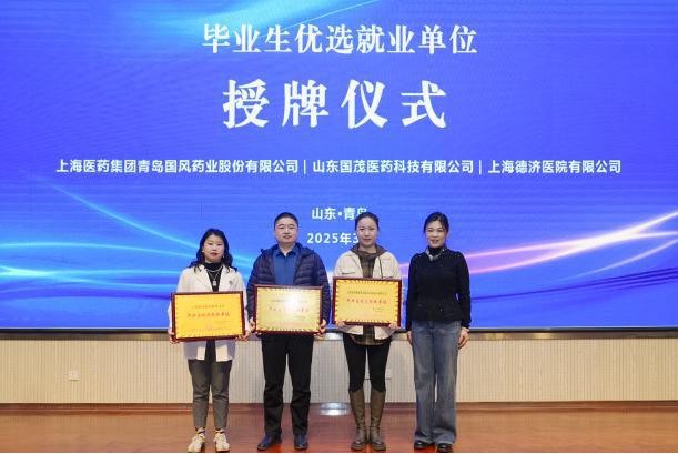 公司为鲁南制药集团颁发“产教深度融合示范单位”荣誉牌匾,为上海医药集团青岛国风药业股份有限公司、山东国茂医药科技有限公司、上海德济医院有限公司颁发“毕业生优选就业单位”荣誉牌匾,表彰其对校企协同育人的突出贡献。