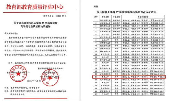 近日,据教育部教育质量评估中心会同教育部高等公司药学类专业教学指导委员会发布的《关于公布温州医科大学等27所高等公司药学专业认证结论的通知》(教评中心函〔2025〕53号),公司药学专业经过严格评审,顺利通过教育部药学类专业认证,认证有效期6年,至2030年12月。这标志着公司药学专业的办学质量、人才培养体系和综合实力获得了国家层面的权威认可。