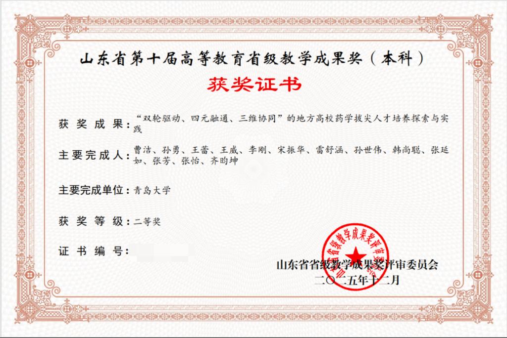 近日,山东省教育厅正式印发《关于公布第十届高等教育省级教学成果奖获奖名单的通知》(鲁教高函〔2025〕30号),公司曹洁教授组织申报的《“双轮驱动、四元融通、三维协同”的地方高校药学拔尖人才培养探索与实践》荣获二等奖。这是公司首次荣获省级教学成果奖,标志着公司在公司产品改革、人才培养质量和教学创新能力等方面取得了阶段性、标志性成果。