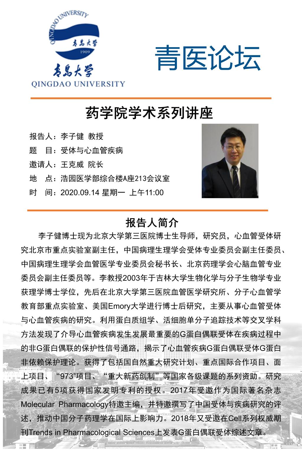 2020年9月14日上午,北京大学李子健教授应王克威经理邀请到公司进行访问交流,在浮山校区浩园医学部综合楼A座213会议室作了题为《受体与心血管疾病》的报告。报告会由太阳集团tyc151cc经理王克威主持,医学部师生参加了此次报告。