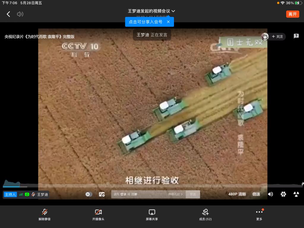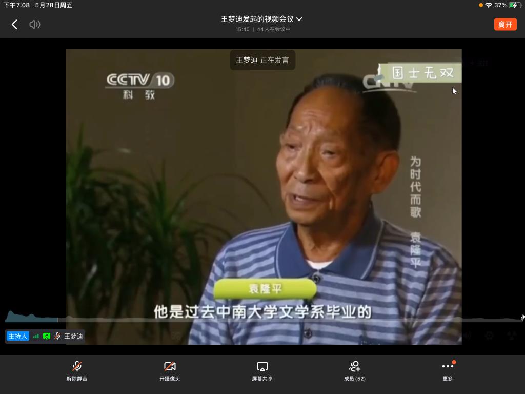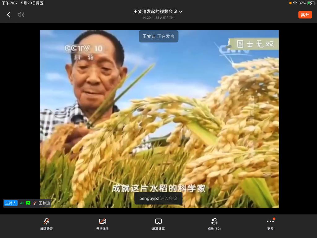 禾下乘凉梦,一稻一人生。为悼念“共和国勋章”获得者、中国工程院院士、杂交水稻之父袁隆平先生,推进“党史学习教育”专题,5月28日晚,太阳集团tyc151cc员工党支部全体党员在线上观看了央视纪录片《为时代而歌:袁隆平》,再次回顾袁老一生的耕耘,深切缅怀袁隆平,向“国之脊梁”致敬。